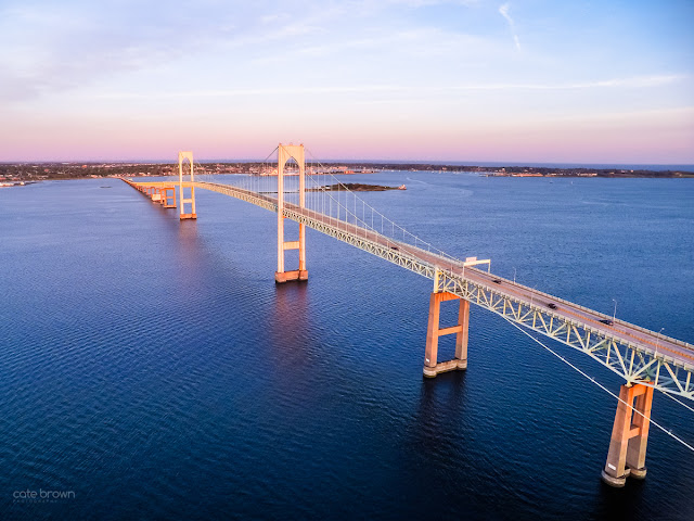 On my way back home, I stopped at the shoreline access parking lot for the Newport Bridge just south of Potter Cove on the east side of Jamestown. Again, I would be pushing the limits of my drone signal, and I just went for it. I went high and far, as far as I could, to get just one composition of the Newport Bridge as sunset really lit up. (For any other pilots out there, it's important to note you shouldn't fly over any cars or people who aren't part of your shoot, so don't go over the bridge, just take a look at it). The sun was done setting and my battery was running out. Mission accomplished.