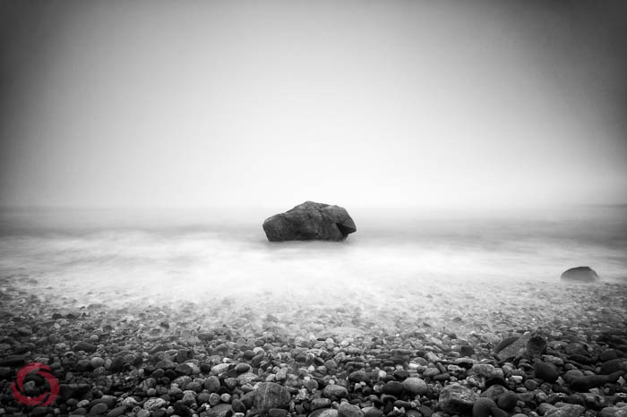 Here is the result, and I knew right away while shooting that this would look stellar as a black and white. Sometimes, despite knowing in my mind I want to convert an image to black and white, the initial reaction of seeing it in color can be very alluring. But I stuck to my guns and did the black and white conversion using Nik Silver Efex Pro software, which has great target control tools compared to Lightroom's general global adjustment tools. The image was always about this boulder, lonely, sitting quietly amidst a cloud of fog. The color version washes the boulder into the background as the blue hues take it over, but in black and white it stands out proudly in the gray fog bank. The black and white also naturally boosts contrast between the rocks along the shoreline, adding an element of texture in an otherwise flat image. In all my years at school and even after a research project on color vs. black and white, a black and white image will be more about textures, contrast and form whereas color images are so often just about the color, which is not always the end goal of a photograph. Sometimes, color is a distraction.