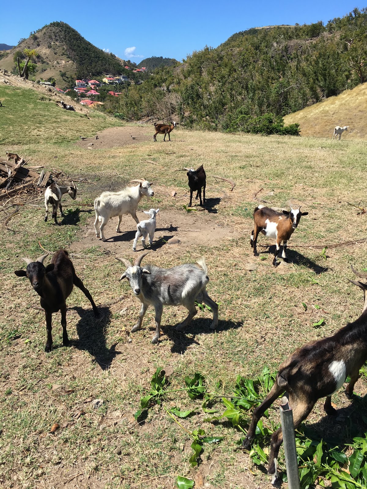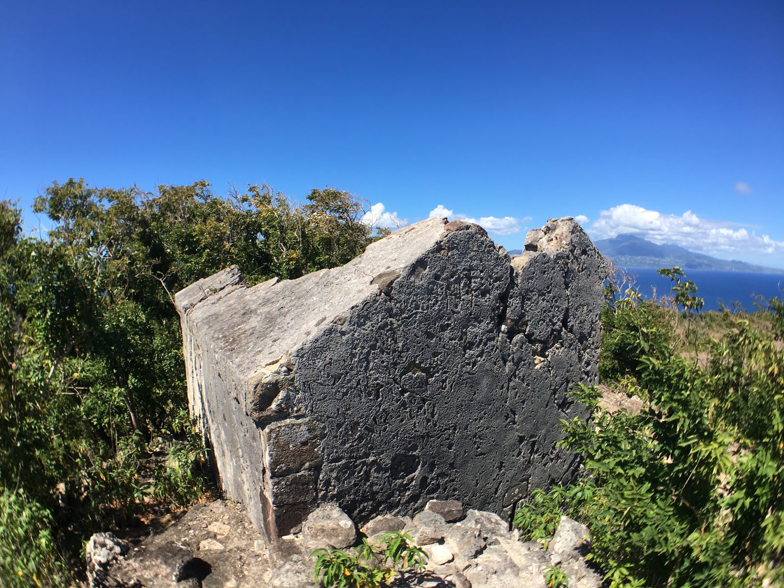 This plan to combine a few activities into one quickly went south as we were hiking more of a steep slope of loose arid soil and gravel in the midday sun, laden with our extra snorkel gear. Whoever said the road to Napoleon was steep by the nature trails to Caroline were a hill certainly misrepresented the quality of these trails. The elevation soon climbed just as high as Fort Napoleon (114m, 374ft) as we looked out towards town across Baie du Marigot. Not all of us made it to the top. Once we reached the trial fork for the beach, half of the crew started to descend while some of us continued onward to the summit where we found an amazing panoramic view of Baie de Pompierre below, and another view out to sea to the north.