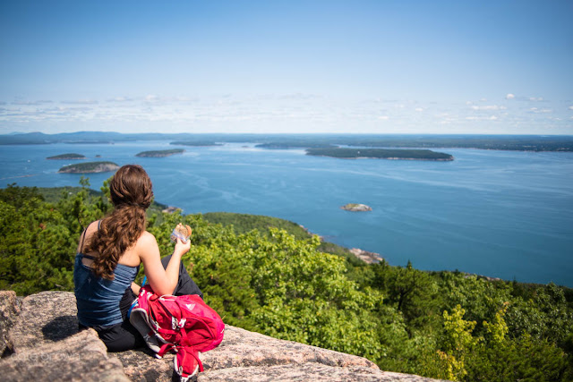 Precipice. By 10am the parking lot is full and people are already parking on the road. Some just use the lot to connect to a few of the other trailheads that converge in the area, but we took the Precipice Trail. Just like Beehive, it's one of Acadia's iron rung trails, climbing from the road to the summit of Mt Champlain at 1,058 ft in under one mile. The trail took us almost twice as long as Beehive. It started with a long section of scrambling over large granite boulders strewn across the mountainside. Almost two thirds of the trail was scrambling before it started to look a bit more like Beehive with a combination of granite steps and little iron rung sections. While the ascent was steeper, the trail was wider in most places. Trees lined the edge of the trail for quite a ways, while Beehive had felt narrower and much more exposed throughout the climb. It wasn't until the last third of Precipice that the trail became incredibly treacherous, as you climbed from ledge to ledge. Some sections of granite were only 6 inches wide, and the iron rungs became ladders going straight up to the summit. But the top of Mount Champlain rewarded all of our efforts with a spectacular 360° view! Champlain isn't the tallest mountain in Acadia by any means. We could see two of the taller summits just next to us with Dorr Mountain at 1,270 ft and the tallest peak of Cadillac Mountain at 1,530 feet. Another lunch break, and we continued on.