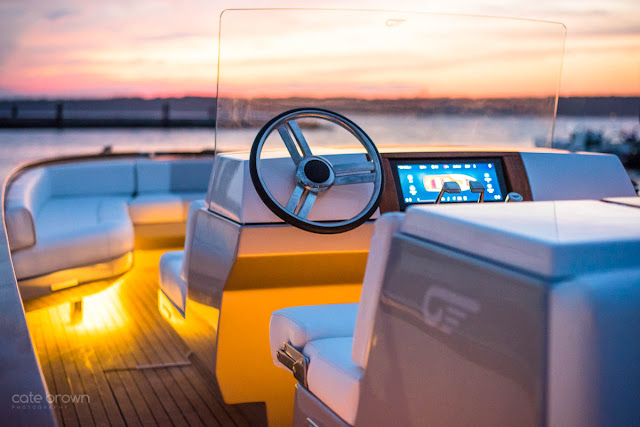 This year, Hinckley unveiled a first of its kind for the luxury powerboat industry: the Dasher. Entirely electric, this sleek 28 footer is powered by lithium ion BMW batteries and a super quiet "Whisper Drive" propulsion system. Complete with custom 3D printed cleats, a retractable windscreen, and artisanal teak rails, she is a beauty to behold.