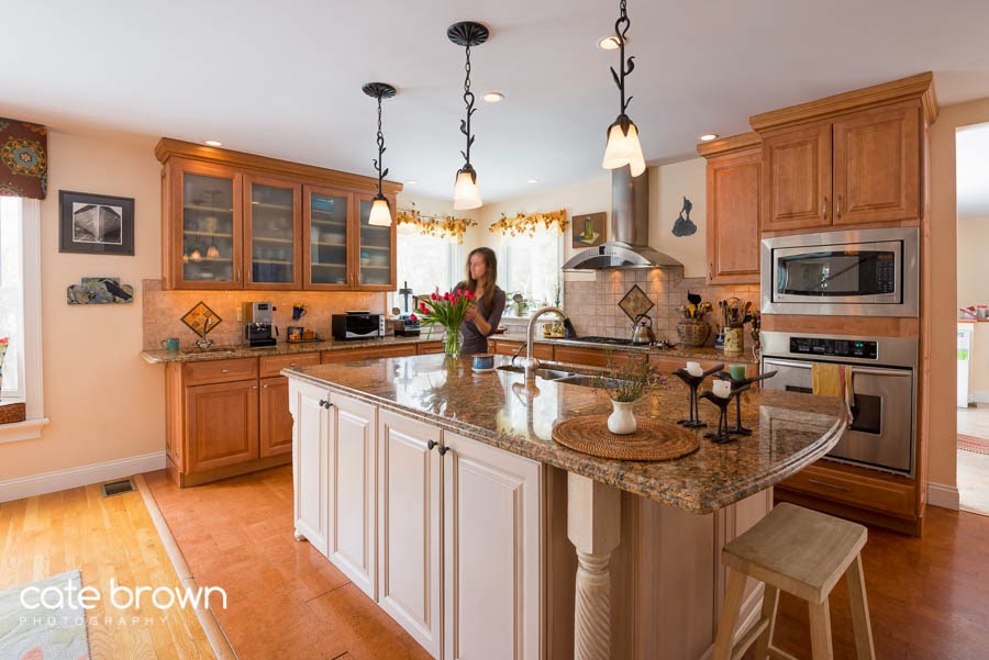 I cleared off the island almost completely, but left several appliances in the background for the sake of time.  Kitchens are often the busiest scenes to stage, by which I mean I had the most objects and elements to consider before taking the final shot.  I could've probably turned the tea kettle so the spout was recognizable, or put a cutting board with a sliced lemon on the counter somewhere.  Other than these small oversights, I was very happy with the final result!