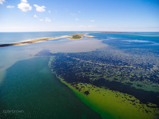 My last day on the island I went back to Madaket Harbor, but this time for an aerial drone session. The tide was low and about a dozen people were out clamming on a Sunday morning. I walked along the marshy tide line until I found a dry sand patch to launch from and explored the harbor by air. The marsh and reef were clearly visible through the clear shallow water, and illuminated to a vibrant green with the noontime sun overhead.