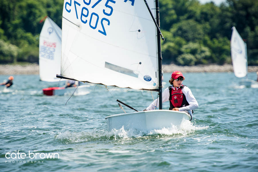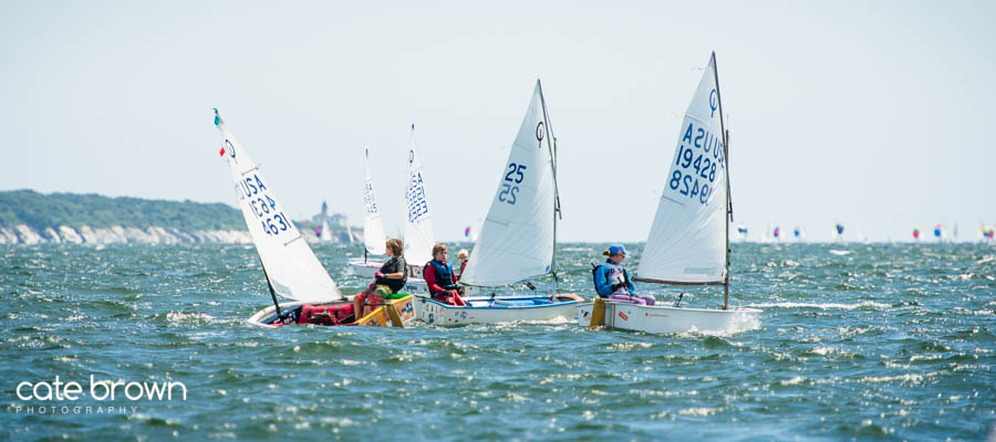 This year was hosted out of Fort Getty in Jamestown, a wonderful little location at Dutch Harbor with easy access to open waters in sight of the open ocean. Day One of racing saw a slight postponement but before long the seabreeze was up, the current was strong, and the sailors were off to the races! I stayed for the whole day at the Opti circle, watching the Red, White, and Blue fleets compete in the wind and chop. A slightly unsettled breeze and a strong current meant for another hour of delay for these young competitors as the Race Committee struggled to perfect the race course and keep their anchors, but once the races got underway they continued without a hitch.