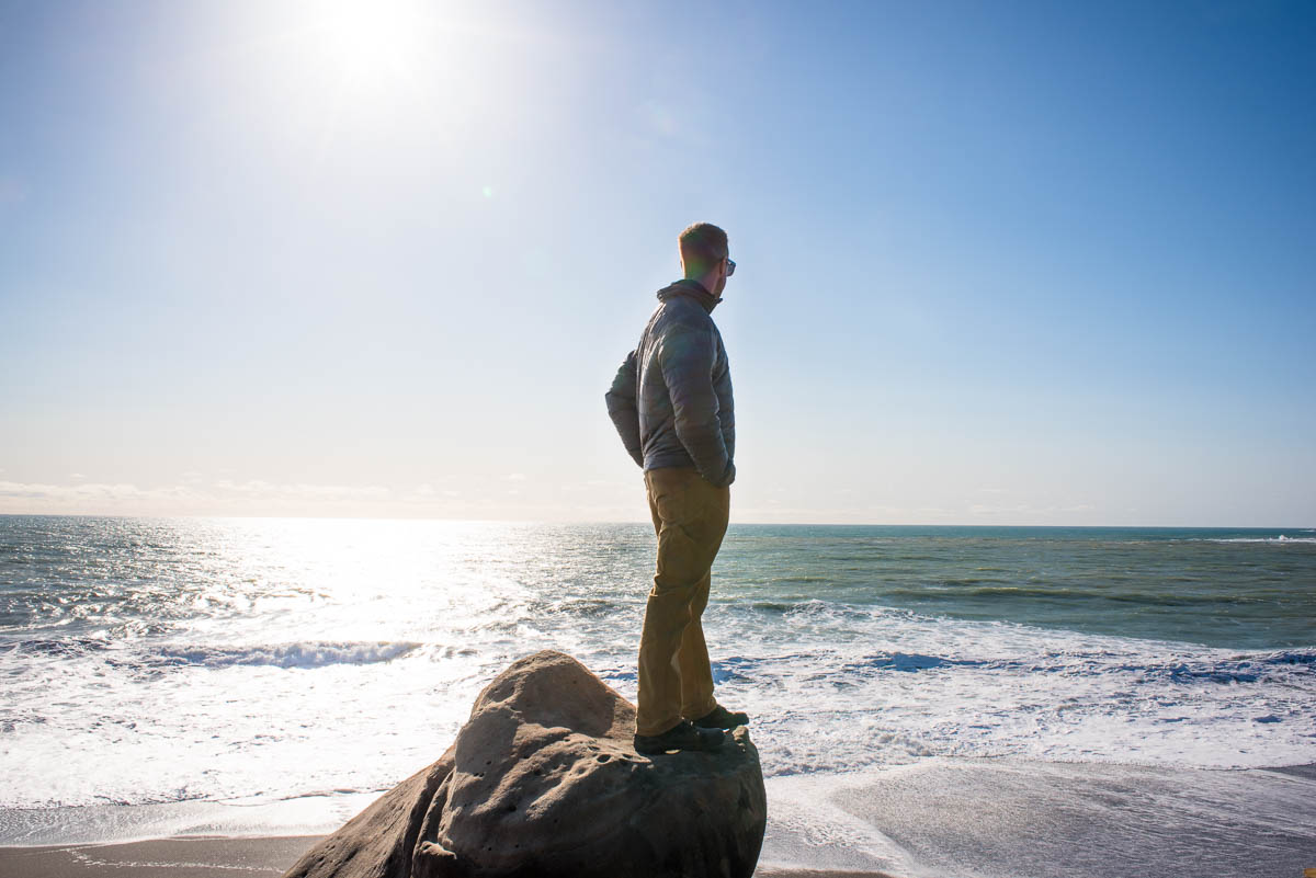 The trail starts from the campgrounds, follows the river, cuts under the highway and through a marsh, before climbing a small hill and reach the beach.  It was cool and still rather windy, but we had a lot of fun exploring the unique sandstone formations.