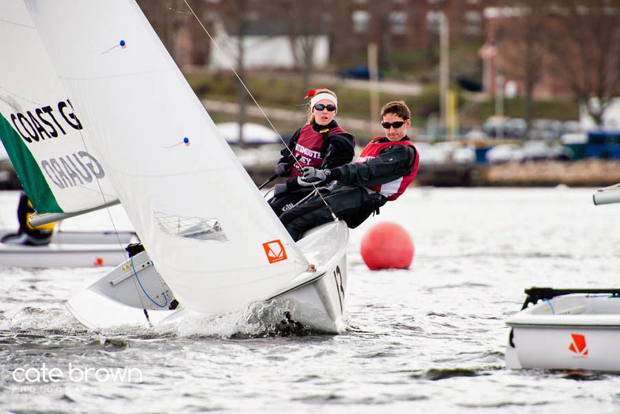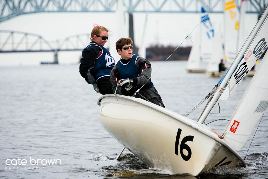 Sunday the sun tried to poke few a few times, but the conditions were just about the same as the day previous. The wind was light and there was still strong currents, but it was a little less extreme compared to Saturday. The event was the O'Day Trophy, the NESSA Championship for fleet racing featuring high schools from across New England. While a few of the CT teams had sailed Saturday, there were additional competitors from high schools in Rhode Island and Massachusetts. Upwind sailing was still a struggle but as the breeze shifted anywhere from 10-30° between races, gusts would start to roll in from the NE corner of the course which allowed sailors to get some momentum as they approached the windward mark and heavy currents at a full beam reach to maintain speed. Racing was competitive and almost no one had consistent finishes, but Hotchkiss came out on top with St. George's and Portsmouth Abbey, both from Rhode Island, coming in second and third respectively. Full results at http://scores.hssailing.org/s14/nessa-oday/