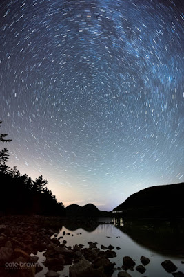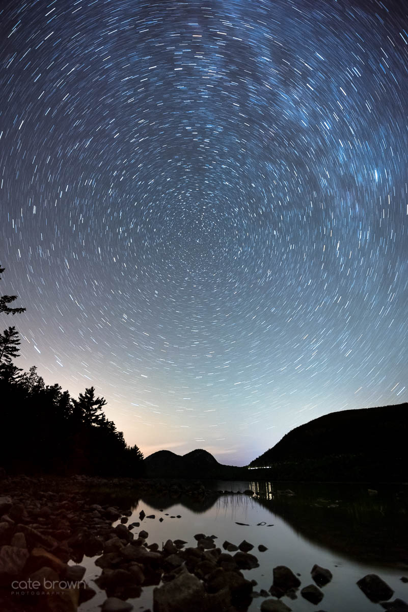 We stopped at Monument Cove where we could look almost due south towards Otter Cliffs. The Milky Way was directly overhead, so we spent about an hour photographing before it had moved to far inland. I can't even explain how dark it was! Compared to the other instances I had tried my hand at astrophotography in Rhode Island where there is significantly more light pollution, my camera was struggling to get the exposure I needed for that starry canvas! We wanted to make the most of our last night in the park, so we also stopped at Jordan Pond. This time, I changed my exposure to 10 minutes long and captured the star trails as they circled Polaris, the North Star, seated directly over the summits of two peaks known as the Bubbles. To get really long star trail photos, exposures need to be at least 30 minutes, but I was exhausted so 10 minutes was all I could muster for the night!