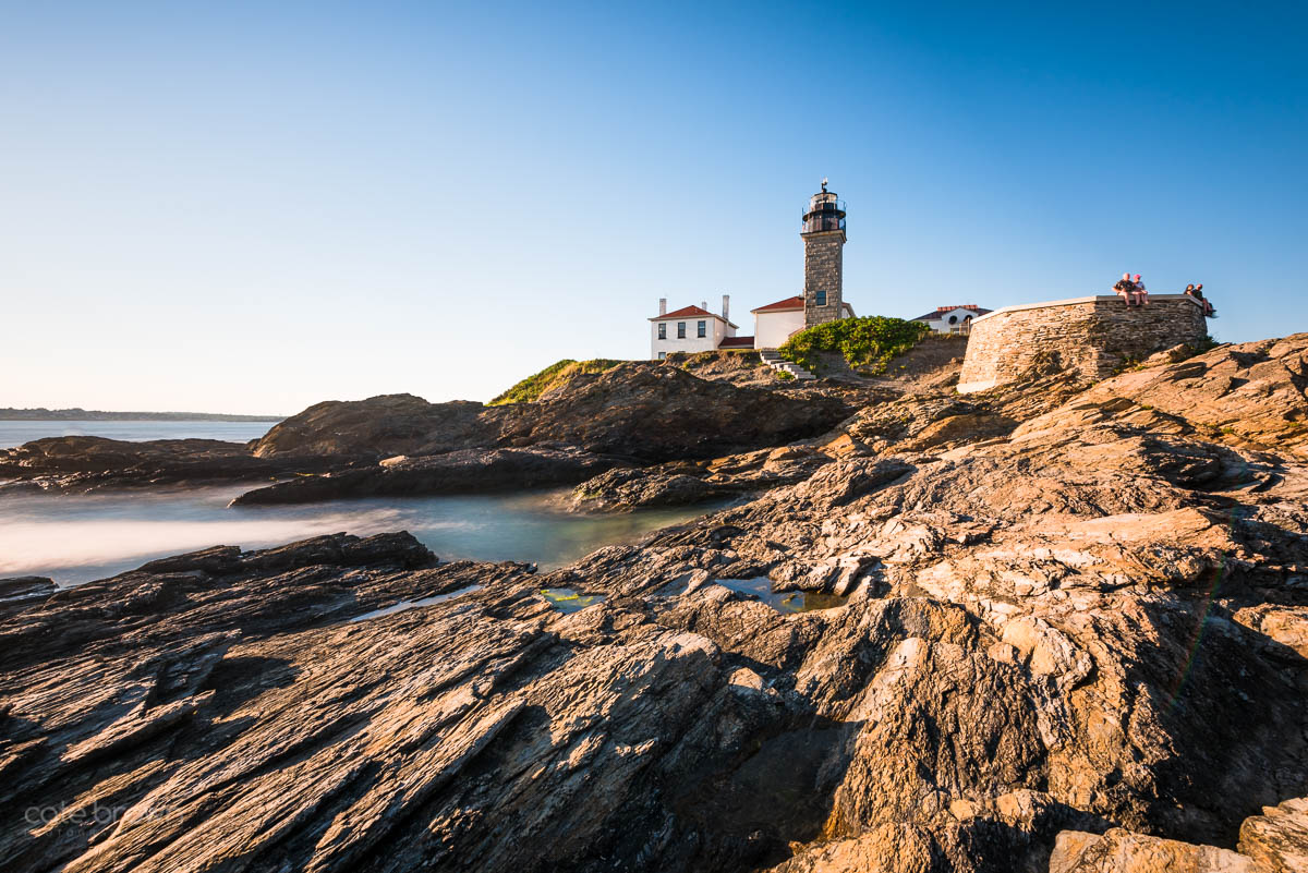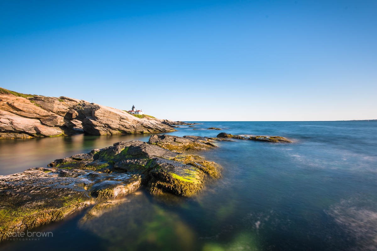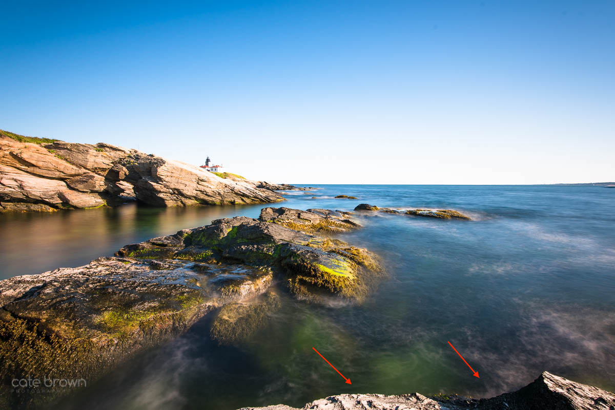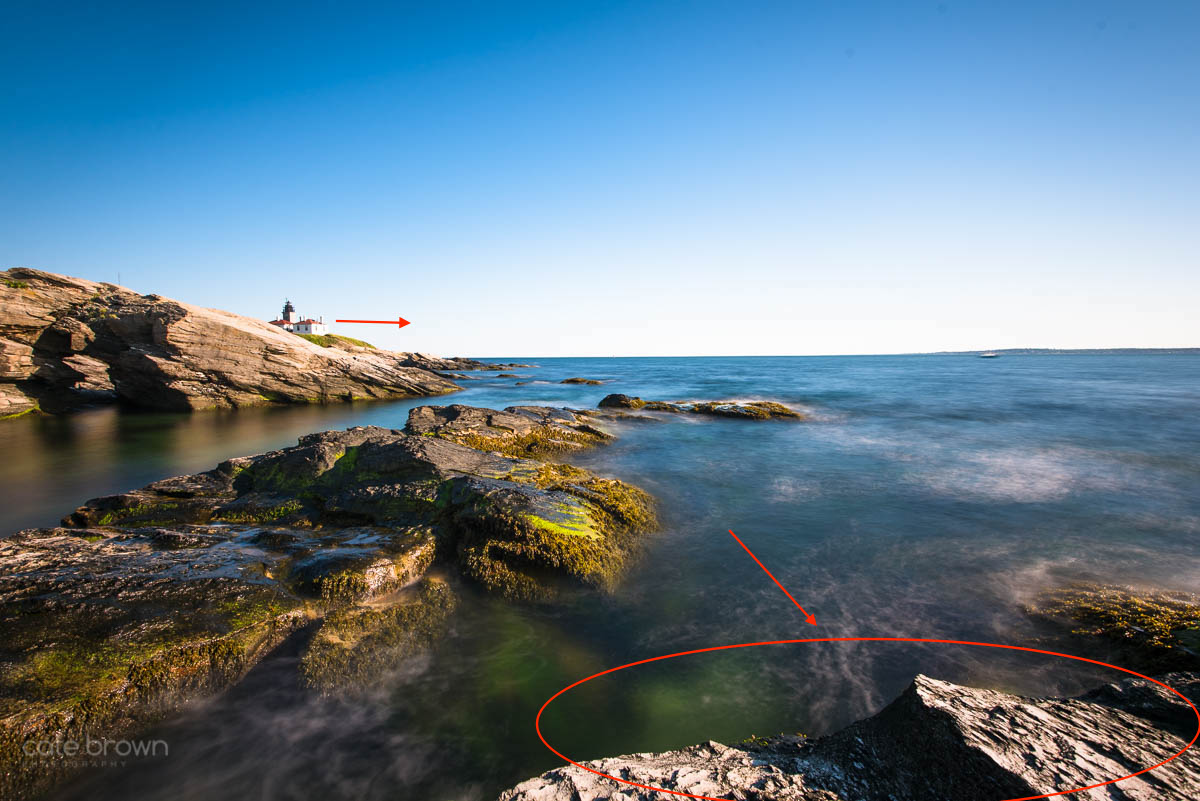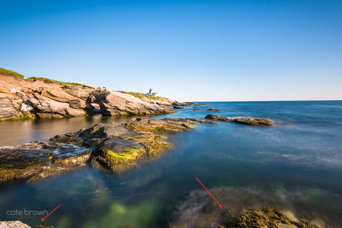 We also tried the angle from the very tip of Beavertail, looking back at the lighthouse. We worked on finding the right balance of foreground rocks to lighthouse, while utilizing the natural leading lines from the rock striations.