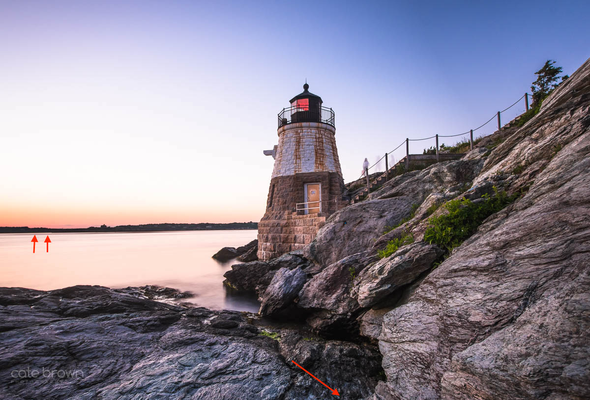 And voila! I over-compensated the bubble level by a few degrees to make the horizon look and feel level. A perfectly centered lighthouse feels better, despite the left hand horizon being empty. Framing the bottom dark patch with some lighter rocks helps hold everything together, and now it feels like all the rocks are sweeping in towards the lighthouse with strong leading lines.