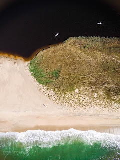 I followed my morning lighthouse visit with a walk through the Ram Pasture Nature Trail, all the way down to the south shore of the island. Here, the southern ends of Hummock Pond and Long Pond are just a few yards from the open ocean. I took flight with the drone to photograph the waves playing along the shore, and even a couple paddle boarders launching into Hummock Pond.