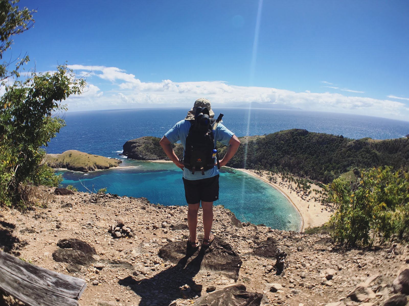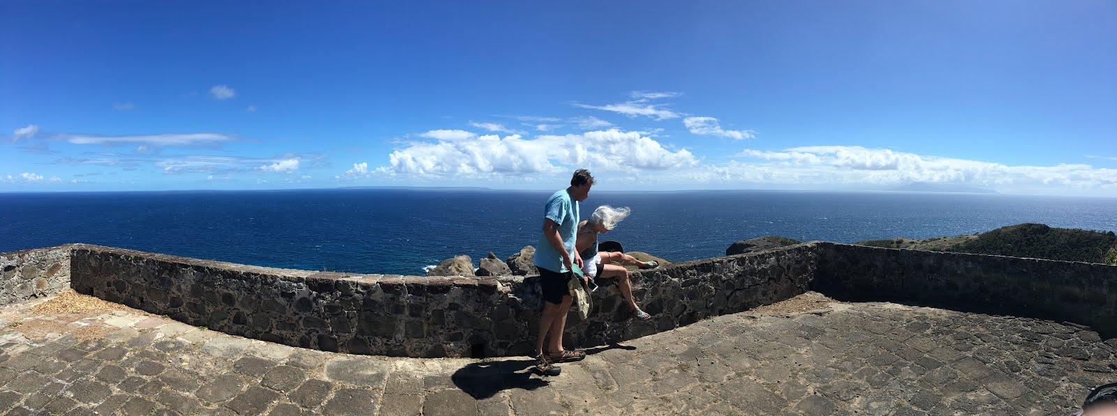 This plan to combine a few activities into one quickly went south as we were hiking more of a steep slope of loose arid soil and gravel in the midday sun, laden with our extra snorkel gear. Whoever said the road to Napoleon was steep by the nature trails to Caroline were a hill certainly misrepresented the quality of these trails. The elevation soon climbed just as high as Fort Napoleon (114m, 374ft) as we looked out towards town across Baie du Marigot. Not all of us made it to the top. Once we reached the trial fork for the beach, half of the crew started to descend while some of us continued onward to the summit where we found an amazing panoramic view of Baie de Pompierre below, and another view out to sea to the north.