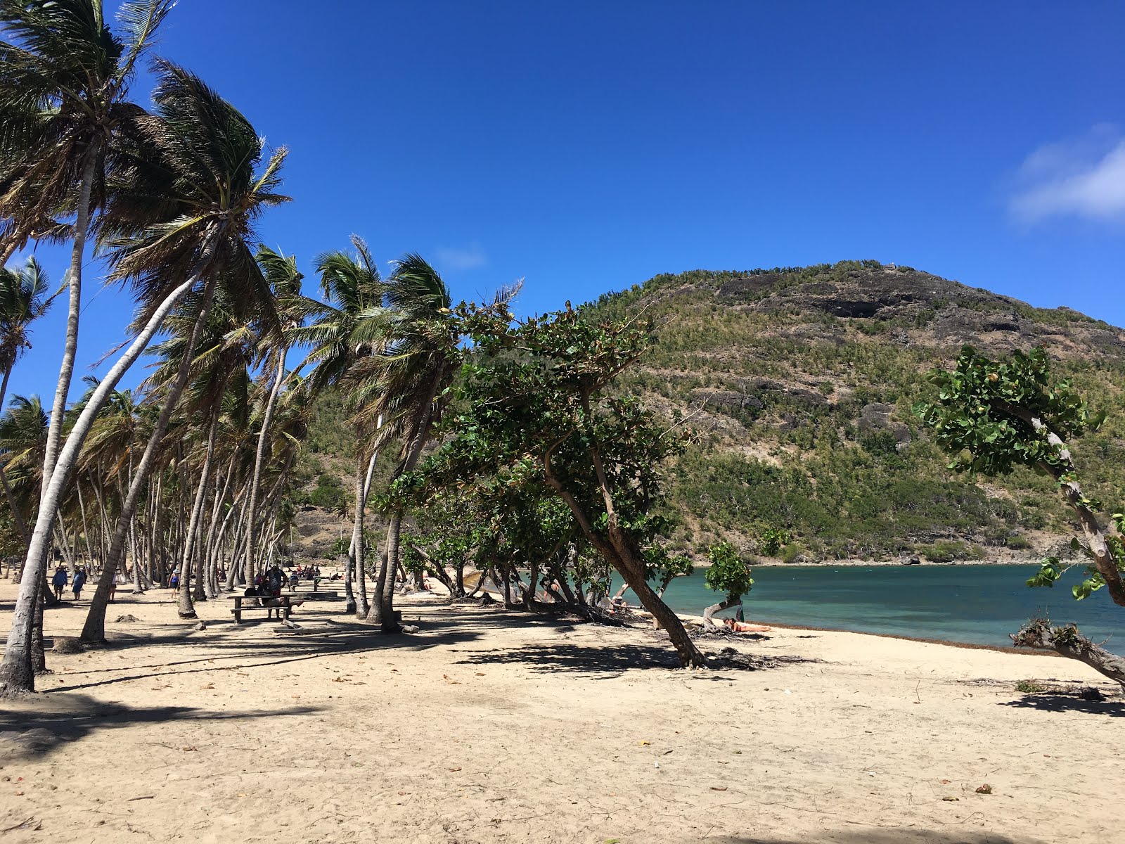 We awoke in a breezy anchorage, nestled between the islands Terre-de-Haut and Îlet à Cabrit in the Les des Saintes island grouping in southwest Guadeloupe. The breeze was already picking up, but it was beautiful and sunny, soon reaching temperatures near 80° by noontime. As boats left harbor, we snagged a mooring in the Bourg des Saintes anchorage closer to town, and went ashore around 10am for a downtown walk and hike. Since Fort Napoleon, the tourist attraction of the area, closed by noon, we decided to visit a nearby Fort Caroline instead and make our way over to Baie de Pompierre for beaching and snorkeling.