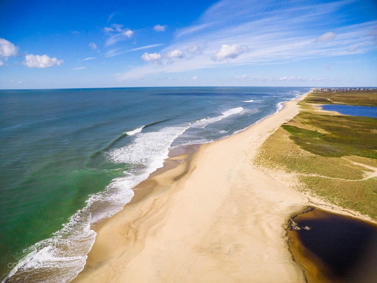 I followed my morning lighthouse visit with a walk through the Ram Pasture Nature Trail, all the way down to the south shore of the island. Here, the southern ends of Hummock Pond and Long Pond are just a few yards from the open ocean. I took flight with the drone to photograph the waves playing along the shore, and even a couple paddle boarders launching into Hummock Pond.