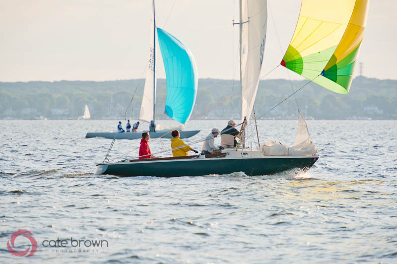 Most recently at race number 4, it was another light air evening.  With 85 degree heat throughout the day and 90%+ humidity, it was one of those hot and sticky days setting heat records all over Rhode Island and Boston.  The weather forecast had unchanged conditions and threats of popup thunderstorms for the entire week, but it was terrific to get out on the water where it would be coolest.