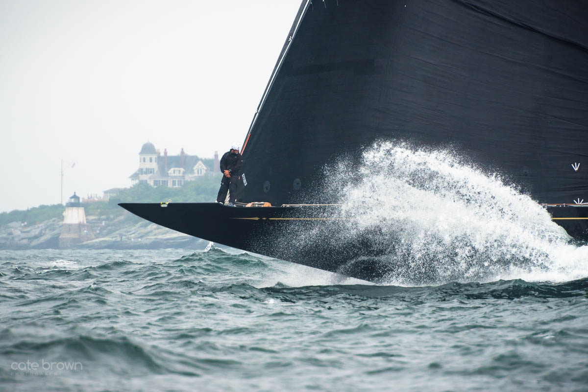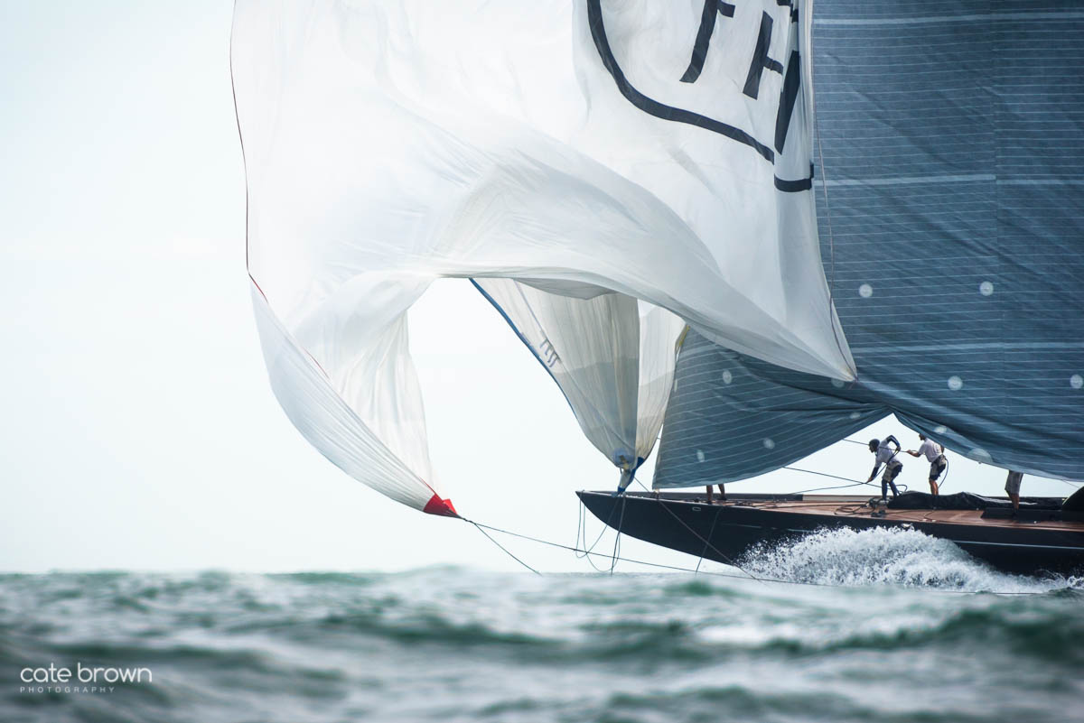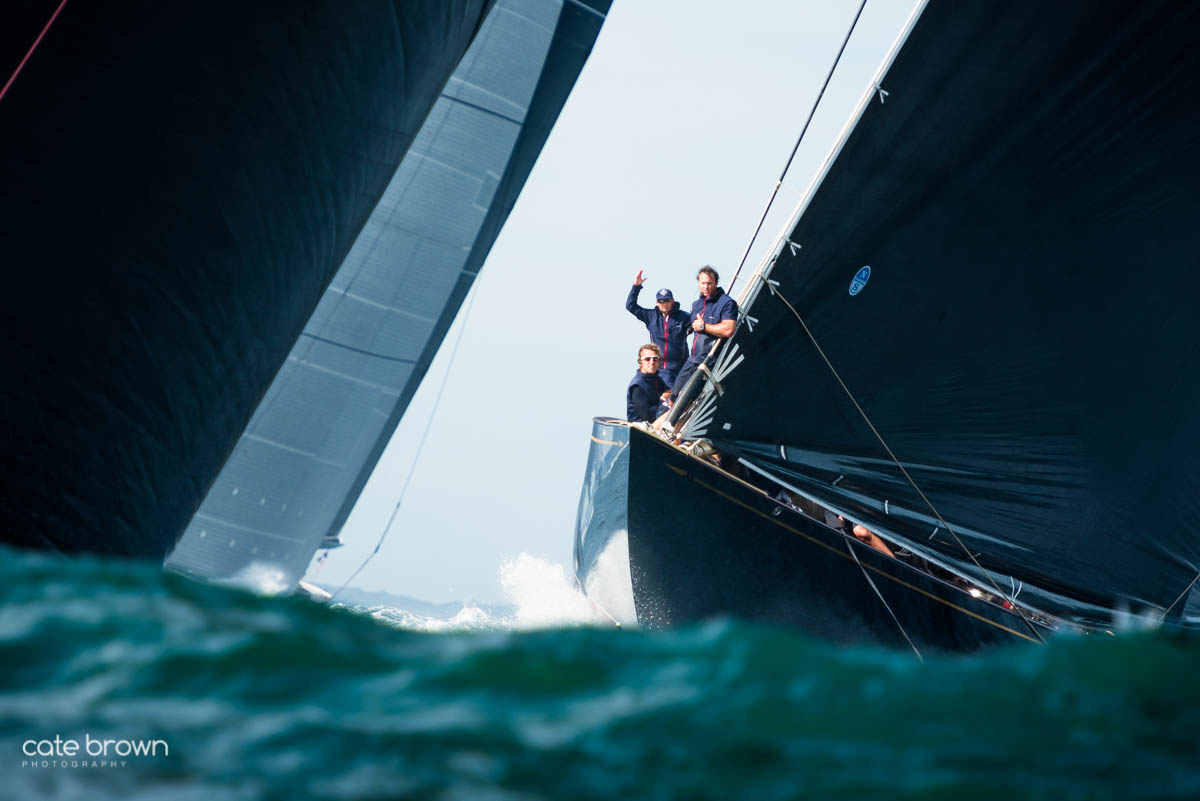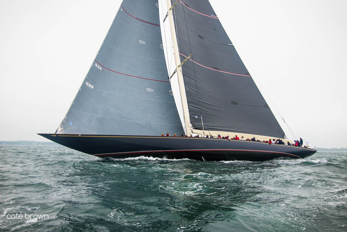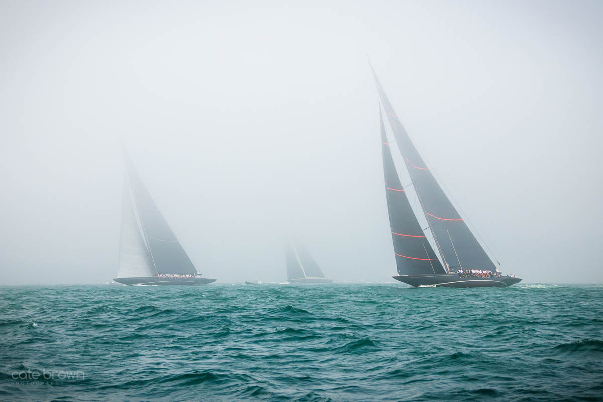 I was out on the water for the first two days of racing where we saw the most wind for the week, coupled with late starts and fog. Day One was the distance race through the East Passage of Narragansett Bay, starting offshore of Beavertail, passing through Newport Harbor, around Gould Island, and back to showcase the spectacle that is J Class racing. The breeze was light, around 7-10 knots. As the starting sequence counted down, the enthusiasm felt by everyone on the water was palpable. Velsheda, perhaps a little too eager to start race one, managed to take off a decent amount of bottom paint at the start as she glanced off the race committee stern. Soon enough, everyone was underway, beating upwind through the fog. The sun started breaking through as the boats came by Beavertail and the Newport Bridge, before fog rolled back in for the finish. While competition was tight throughout most of the course, Hanuman, skippered by local legend Ken Read, won the day for this 20nm race.
