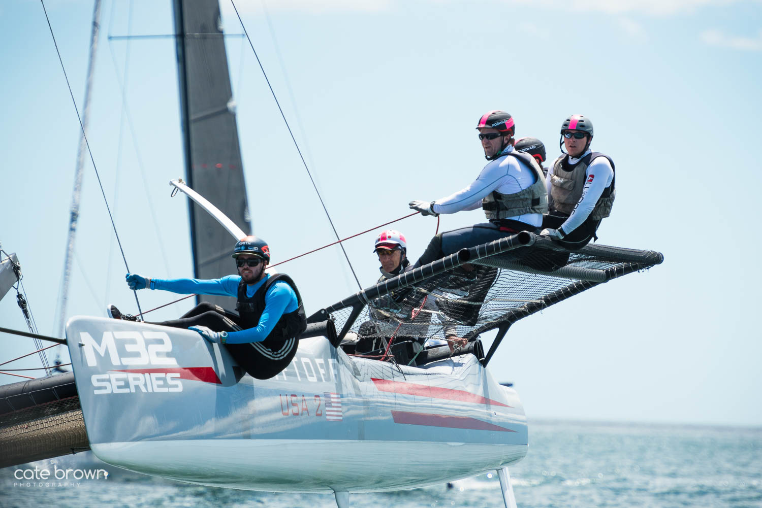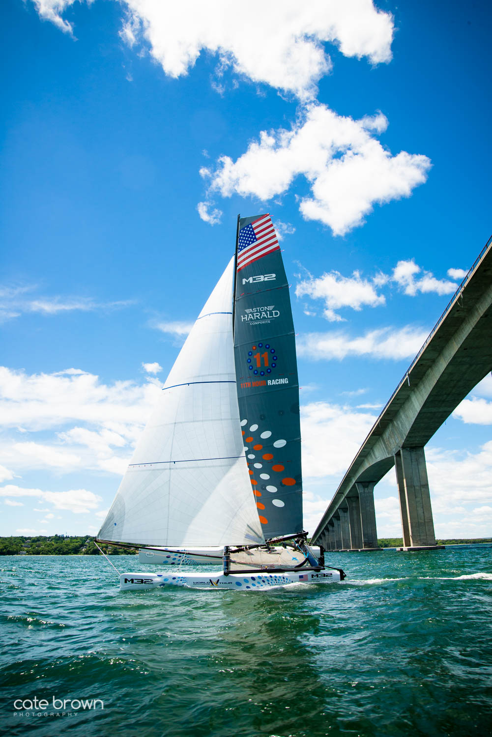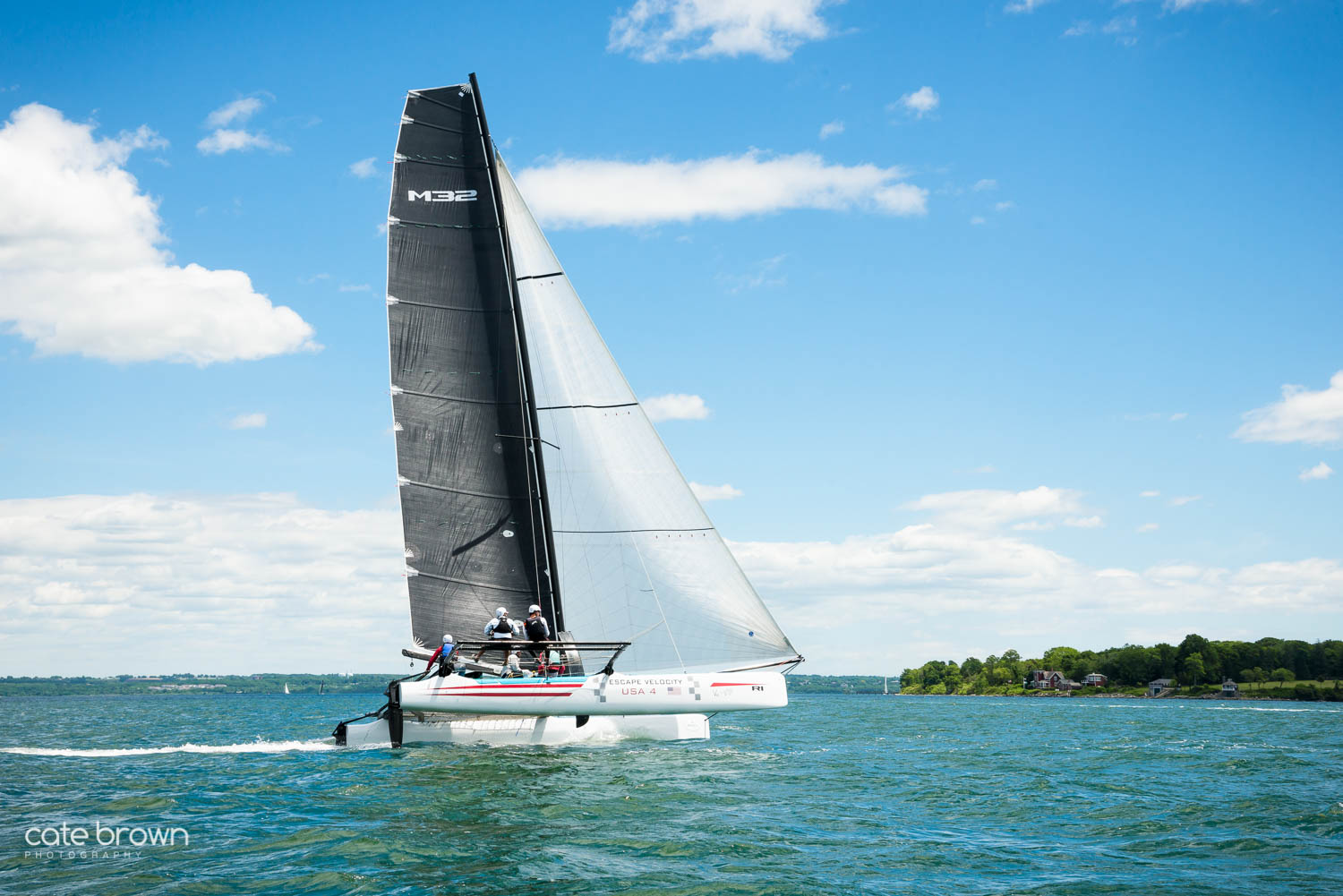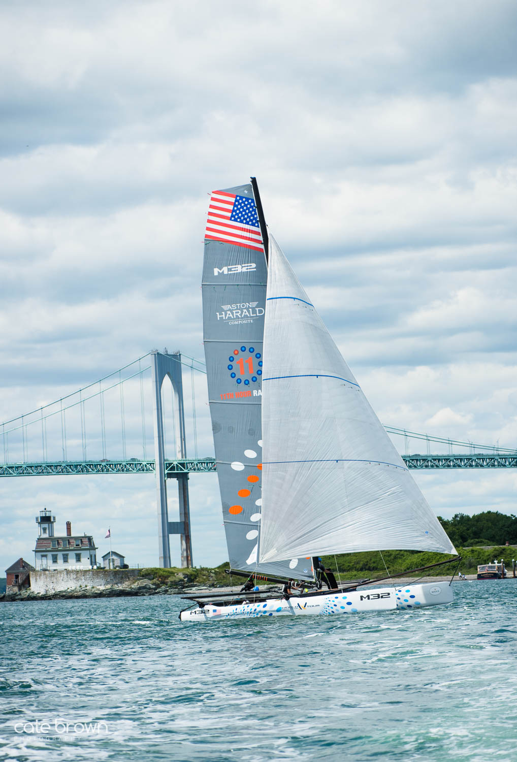 Friday started with high winds in the morning that faded around noontime and were almost completely gone by mid-afternoon. I was out on the water with the M32 class catamarans. This new class of boat had 7 skippers for the NYYC Annual, and they were sent off racing with the second start of the day behind the Gunboats. These fast cats rounded the island ahead of everyone else and finished with enough time to do some class practice races by Rose Island before the next boats even crossed the finish line. I can't even imagine how incredibly they must perform in more than 12 knots!