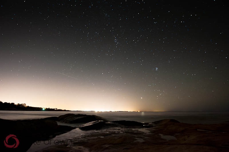 But as I climbed down I could still only hear surf but then I could see just your average mid incoming tide breaking over the rocks. And the rocks splayed out into the sea, making wonderful flat viewing platforms for the night sky. I found a dry patch of rock that would not see an ounce of water for my entire visit, put my pack down in a dry and secure nook of rock, and went to work. It's hard to focus the camera in the dark with a dim flashlight as your only aid, but I did my best.